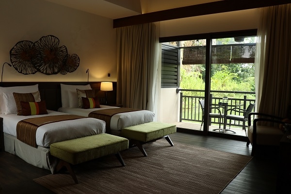 お部屋はいちばんお手頃なレイクヴィラのカテゴリーでした。ドアを開けるとゆとりのある広い空間にツインベッドが置かれ、右手奥に池に面したバルコニーがあります。バスルームは、洗面ボウル2つ、トイレ、シャワー、屋外バスタブ、屋外ミニプールを完備。予約プランによるかもしれませんが、ミニバーが無料で、ペットボトル水のほか、冷蔵庫の中のソフトドリンク、ナッツ類、チョコバーなどが無料でした。