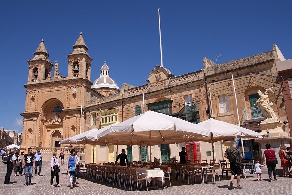 マルサシュロックの中心の広場に堂々と建つ教会。2本の尖塔の間には船に乗るマリア様が飾られているのが港町ならでは。こじんまりとしていますが、赤を基調とした内装、たくさんのシャンデリア、水色のクーポラなど、きれいな教会でした。