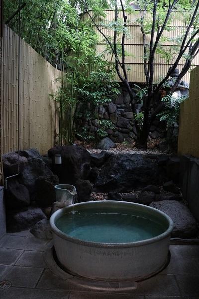 大浴場は一番上の階にあり、内風呂は熱いお湯とぬるいお湯の2種類、そして露天風呂は塀で仕切られていますが、小窓を開けると外を眺めることができます。奥には竹枕が設置されており、寝転がってお湯につかることができます。大浴場のほかに予約制の貸切風呂もありました。