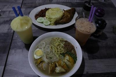1軒のお店でソトアヤム(鶏肉の汁麺)、別のお店でナシレマのオムライス風を買い、ドリンクコーナーで冷たいテタリとマンゴーシェイクを購入。それなりの味でしたがボリュームたっぷりで満腹になりました。