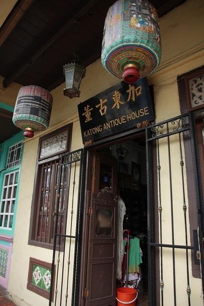 カトン地区にあるアンティーク店。趣のある建物で、重厚な木の扉、提灯、壁のタイルなど、典型的なショップハウスのつくり。