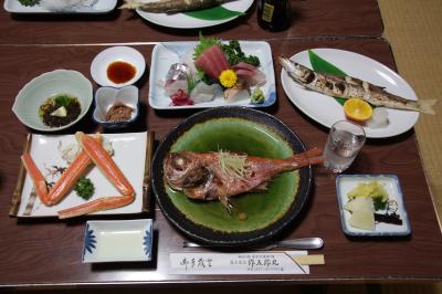 食事は部屋食です。夕食の目玉(と勝手に思っているの)は金目鯛の煮つけです。こんな薄い色のお出汁は珍しいと思うのですが、みりんベースのちょっと甘めの味付け。1人1尾ドドーンと出ます。これだけでも満足ですが、他にも、お造り(新鮮で種類も豊富)、焼き魚、茹でカニ(これはさすがにカニ自慢のところにはかなわない)、イカの塩辛など、海の幸尽くし。朝食も干物や貝エキスたっぷりのお味噌汁など、やはり海のもの中心。