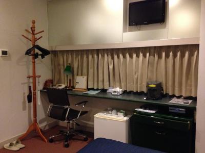 泊まったのはツインルーム。決して広くはありませんが、機能的なつくりで、冷蔵庫、スリッパ、お茶セットなどの基本的なラインナップのほか、消臭スプレーがあったり、浴室には体を洗うスポンジも用意されていたり、ちょっとしたプラスアルファの心遣いがうれしいです。パジャマはユニクロでした。