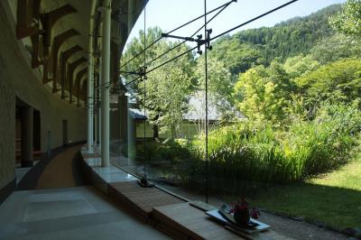 ブログなどで情報収集すると、雪景色や紅葉も素敵そうでしたが、私が一番惹かれたのは新緑。カーブした全面ガラス張りの廊下の向こうに瑞々しい緑のお庭が広がる景色が見たくて、初夏に訪れました。