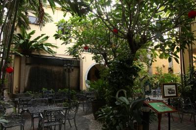 朝食会場となる中庭も緑が多く気持ちのいい空間です。朝食は口コミどおり味はそれほどでもありませんが、種類はけっこう充実していました。