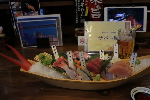はいむるぶしに宿泊しましたが、事前に電話予約しておくと送迎してくれます。東京の居酒屋並みにお値段が張りますが、アーサーと島豆腐、ソーキ、シャコ貝の肝ポン酢、牛のタタキなど、どれも丁寧に作られた優しい味でおいしくいただきました。