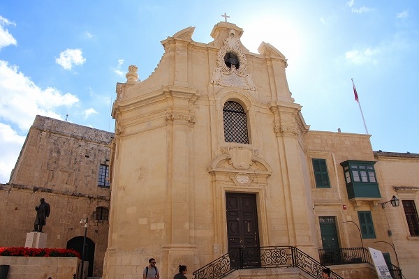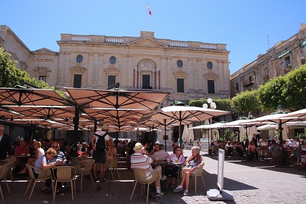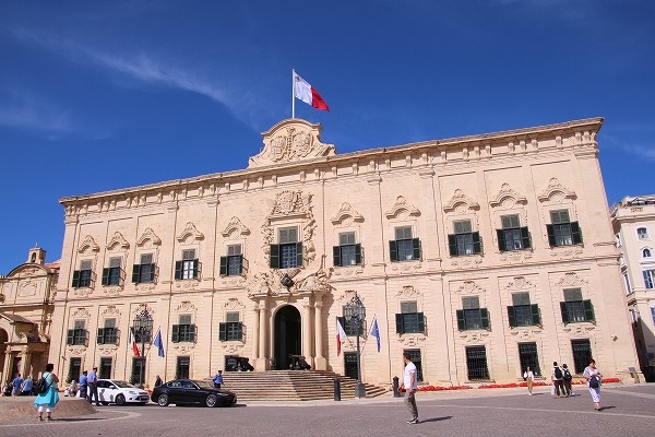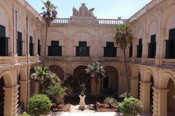 ヴァレッタの街の入口に近い広場に面して旗をたなびかせて威風堂々と建っています。もとは騎士団の宿泊所だったものを改装したそうで、現在は首相官邸として使われているため、内部見学はできませんが、さすが立派な建物です。広中らは海も見えて気持ちの良い空間です。