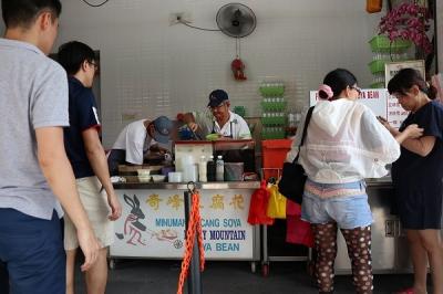 もやしチキンで有名な老黄芽菜鶏沙河粉と同じ通りにあるので、食後のデザートにおすすめ。買う人と食べている人が入り乱れて群がっていて、繁盛していました。冷たい豆腐花を注文。お椀に入った豆腐花の本体はしっかり豆の味がしてそれほど甘くなく、汁分がほんのり甘い。つるんと喉越し滑らかなのであっという間に平らげました。