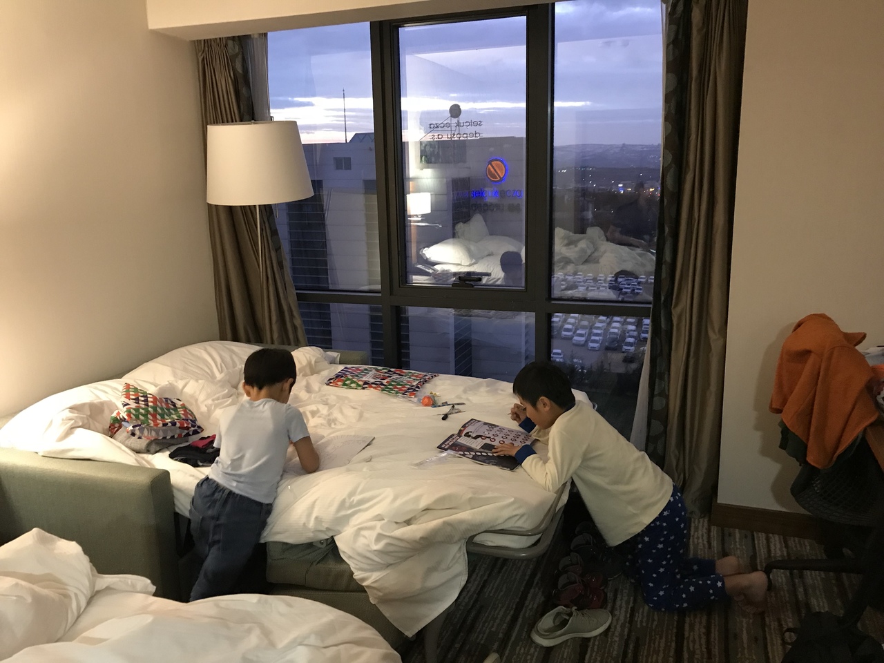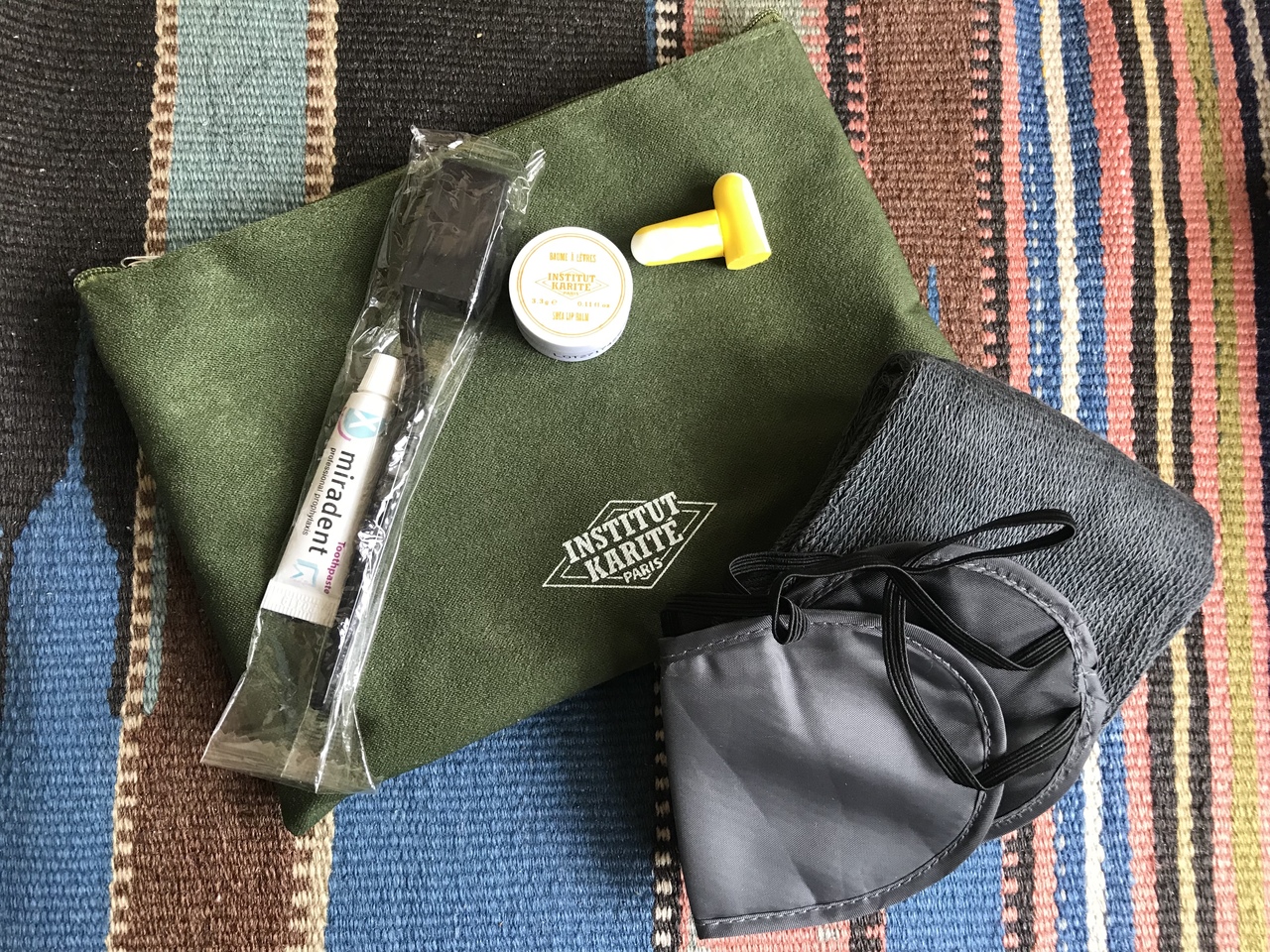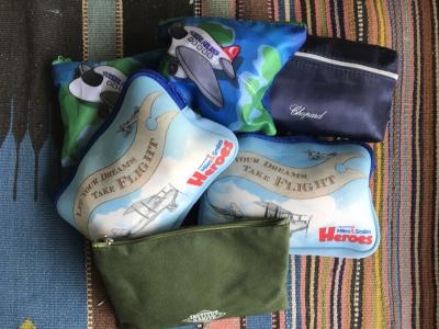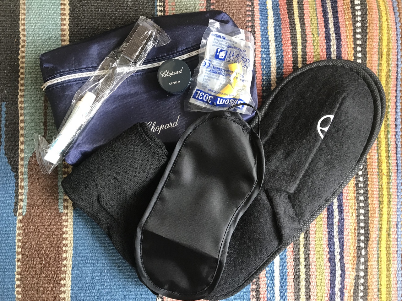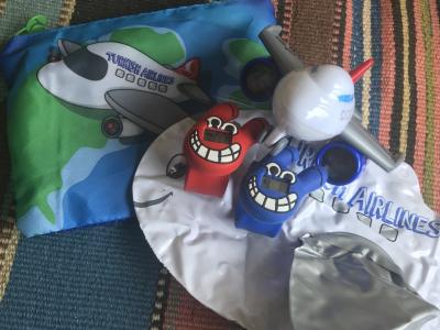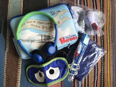 2つのポーチのうち、水色のほうには(ポーチの素材が厚手のクッション素材)靴下、ハブラシ、キッズスリッパ(厚手でしっかりした生地)、可愛いデザインのアイマスク、もちもちした素材の飛行機のおもちゃ、キッズ用のヘッドホン。青色のほうは、ポーチがメッシュ素材で、中には赤と青のリストバンド型の腕時計。めちゃくちゃ可愛いデザイン。そして、飛行機型の双眼鏡!ビニールの飛行機。荷物は増えますが、帰国してからも使えて楽しいグッズでした。- 旅行時期