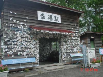 駅舎の中は、この駅から幸福へ旅立とうと訪れた方達の名刺がいっぱい張ってあります。