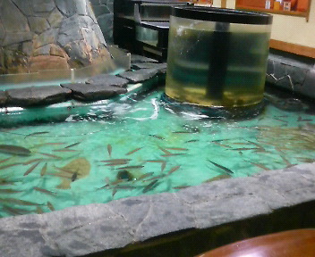 福岡あたりだと良く見かける生簀タイプの店「漁火」、宿泊するとここで夕食とることもあります。新鮮な刺身が出され、全体的に料理の量も多いです。