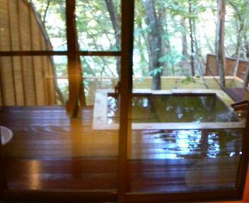 10棟程度のコテージがあり、夫々の部屋には露天風呂が二種類ついています。露天風呂の下には多分鬼怒川が流れていて、ライン下りの船が行き来している風景が林の中をとおして見えます。