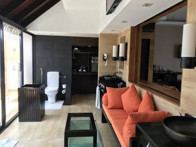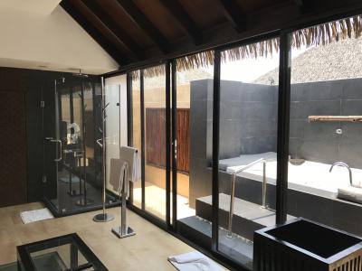 客室の奥が水回りで、洗面シンクは二つ、シャワーブースは独立、トイレは仕切りなくとてもオープンな作りで新婚さんにはきついかも。水回りの先は屋外になり、ジャグジーバスがあり、その両脇は物干しで風通しがよいので、水着の乾きも早いです。