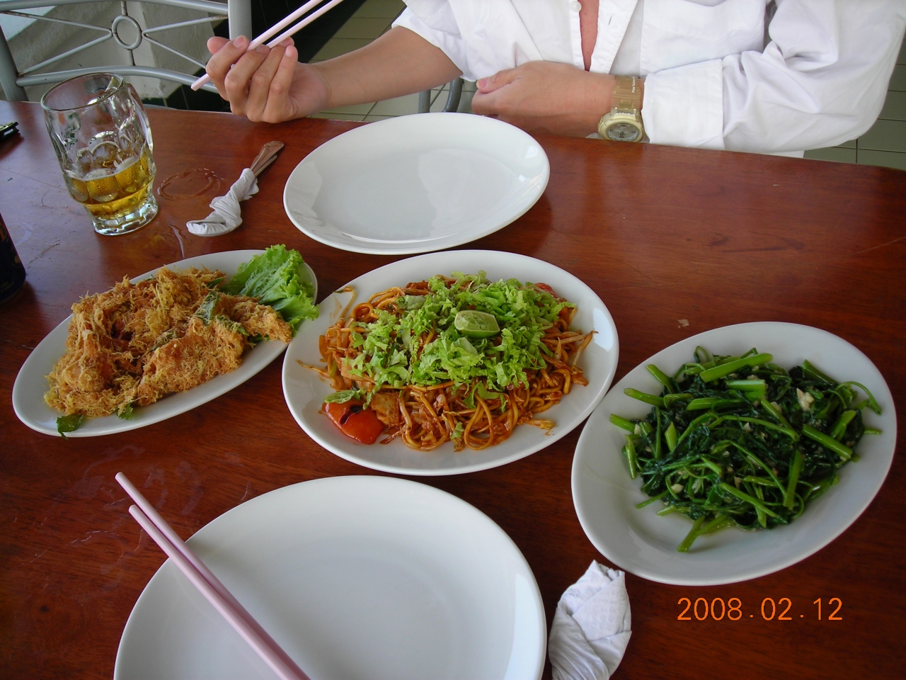 二人で缶ビール5~6本、麺又は飯ものSサイズ1皿、野菜炒めSサイズ1皿、メインの魚介料理Sサイズ1皿で50~60RM。