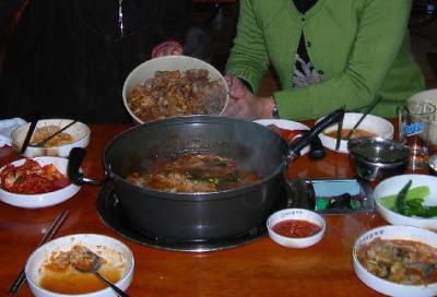 カムジャタンは豚の背骨肉とジャガイモや野菜などを煮込んだピリ辛鍋料理で、本当は締めにご飯を追加してチャーハンにするとグーなようですが、朝ということもあり、4人で中鍋でもそこまでたどりつけませんでした。残念。次回はお腹を空かして行くぞ!