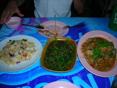 チャーンビール2本、プーパッポンカリー、空芯菜の炒め物、卵チャーハンで540バーツ(約1,500円)。
