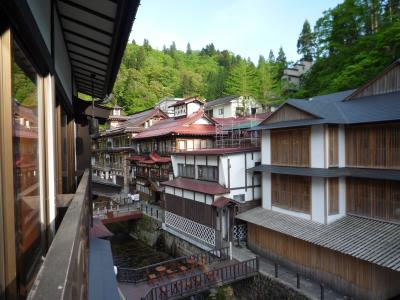 窓からは銀山温泉の川沿いの旅館が一望、ずっと見ていてあきません。
