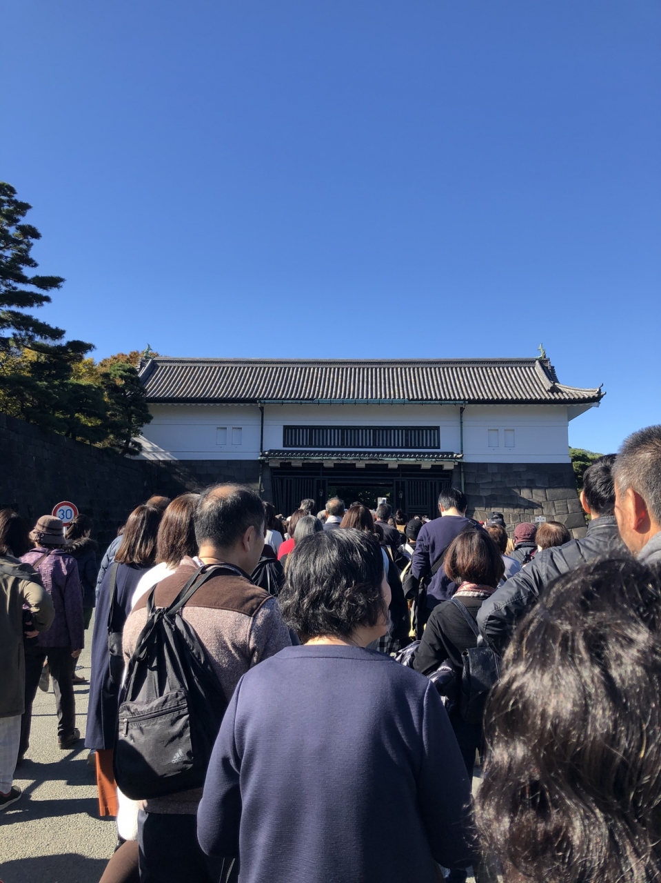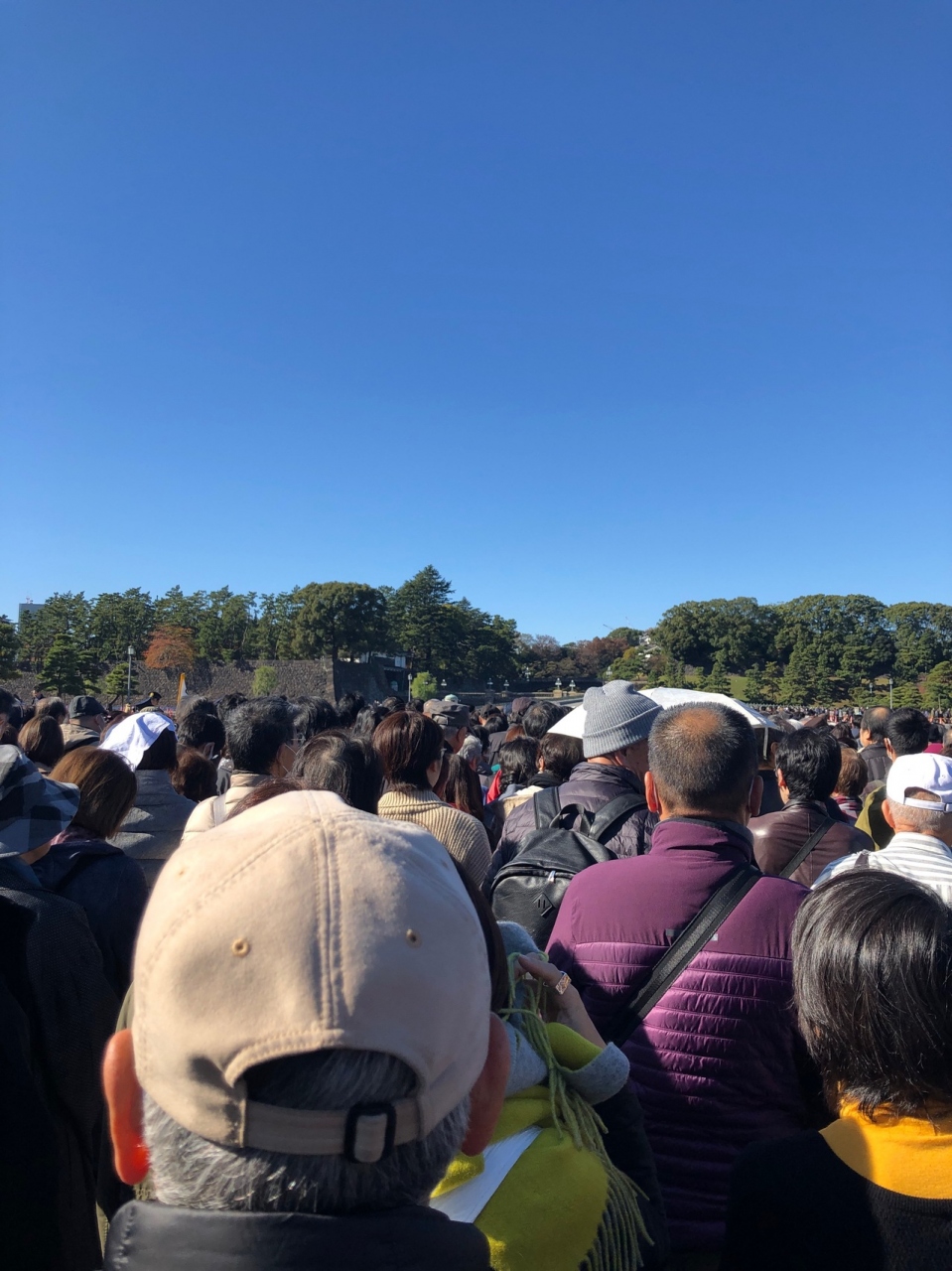 大嘗宮が公開されている特別期間に行きました。東京駅から歩いていきました。すごく混んでいて、広場で並びました。桜の季節に乾通りが公開されているときより、比べものにならないくらい人が多かったです。平日でもとて並んだので、休日はもっと並ぶんだろうなと思いました。