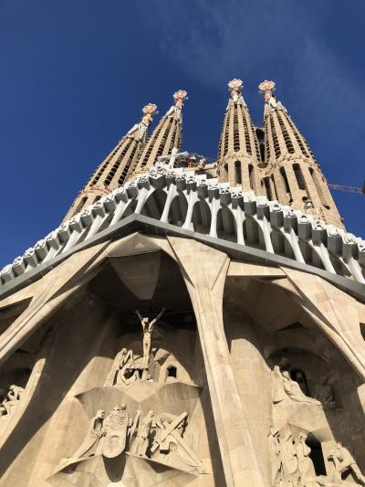 サグラダファミリア内部を見学すると、出口側にある広場です。キリストの最期が描かれた、カクカクした彫刻が特徴の受難のファサードがよく見えました。