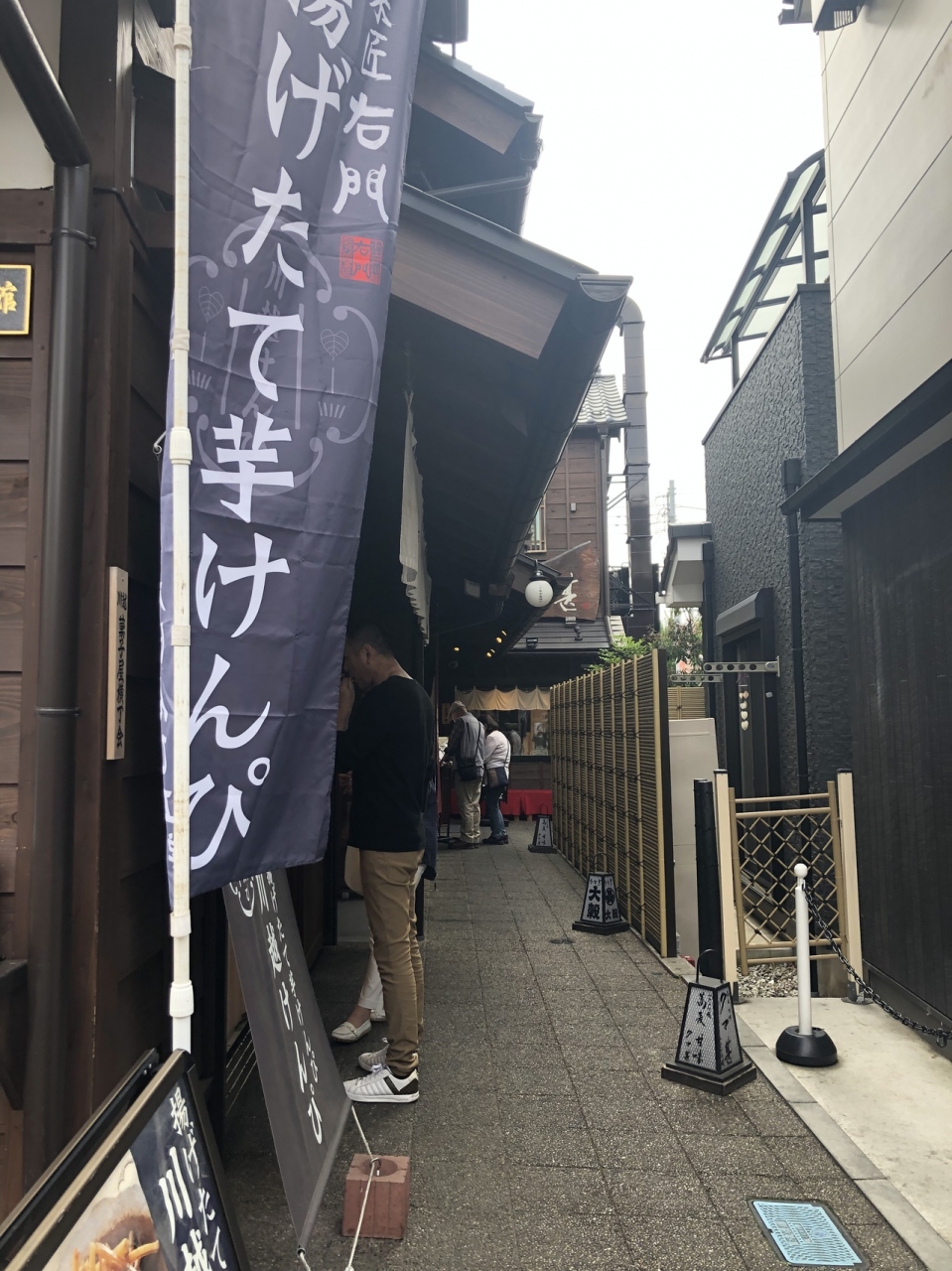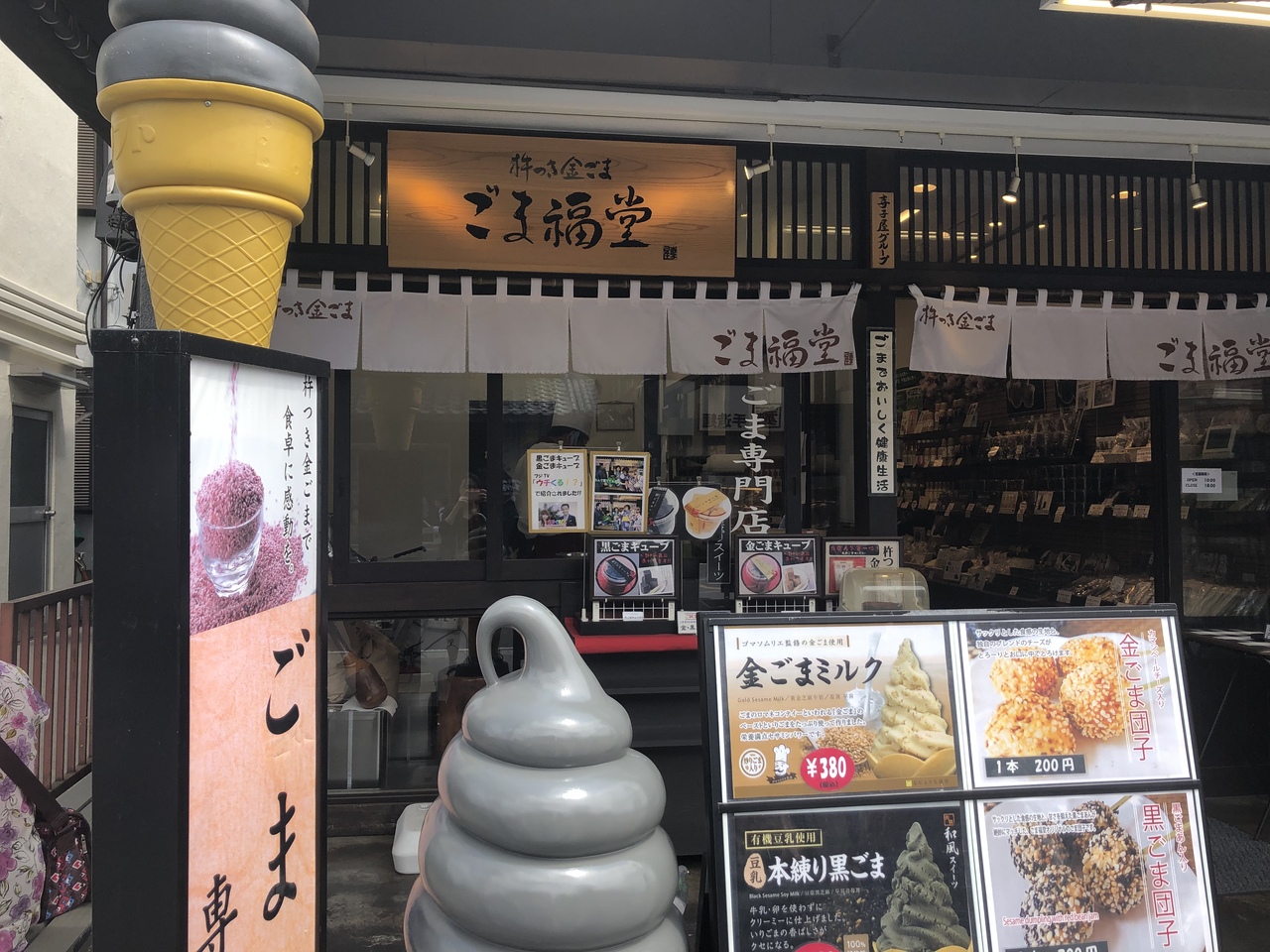 菓子屋横丁にお店がありました。蔵の街エリアから歩いていきました。菓子屋横丁は通りが狭いですが、平日の昼間に行ったところ、人が少なく空いていたので食べ歩きできるとおもいます。いもけんぴのお店で、ソフトクリームにもいもけんぴが刺さっていました。