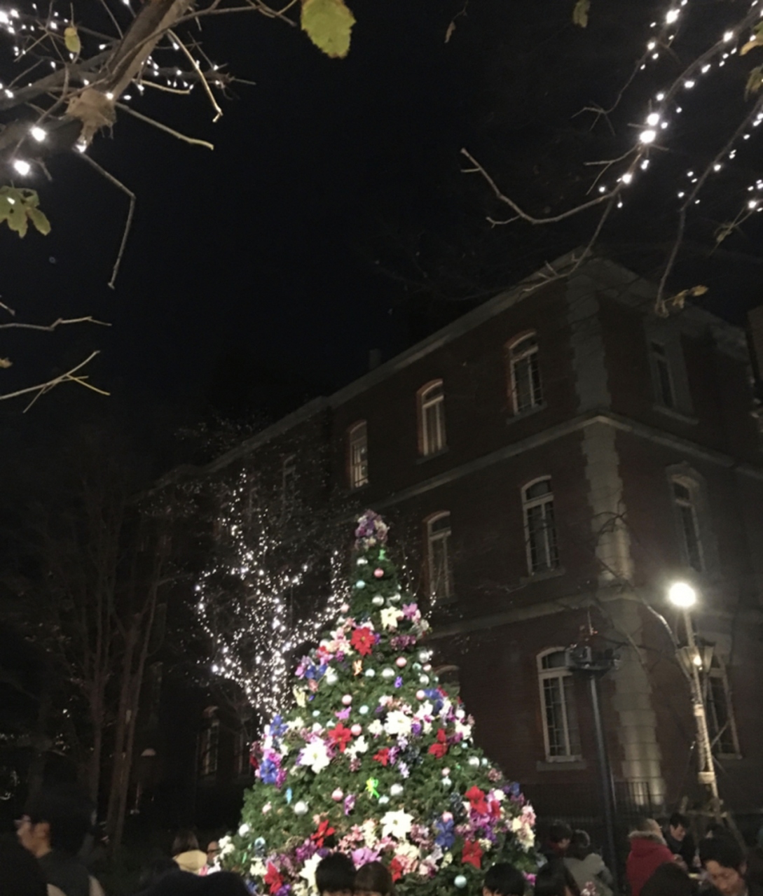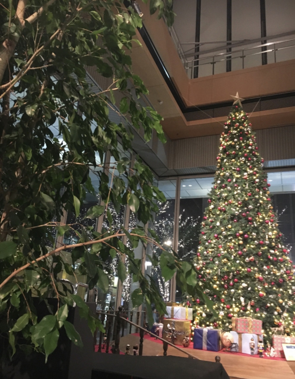 東京駅、丸の内周辺はクリスマスの時期になるとさまざまなところでクリスマスツリーが出現します。こちらの丸の内ブリックスクエアにもクリスマスツリーがありました。お花が装飾されており、かわらいらしいクリスマスツリーでした。周りには人混みができていました。