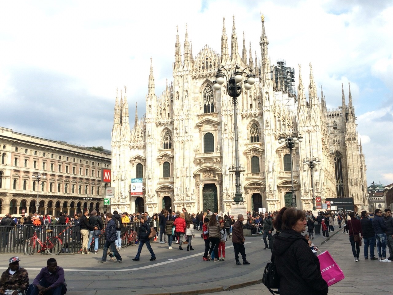 メトロのDuomo駅から地上へ出ると、この広場です。目の前にはミラノ観光の定番スポットのひとつ、ドゥオモが建っています。大きな広場ですが、観光客がたくさんおり、大変にぎわっています。ドゥオモの写真を撮れる定番スポットです。