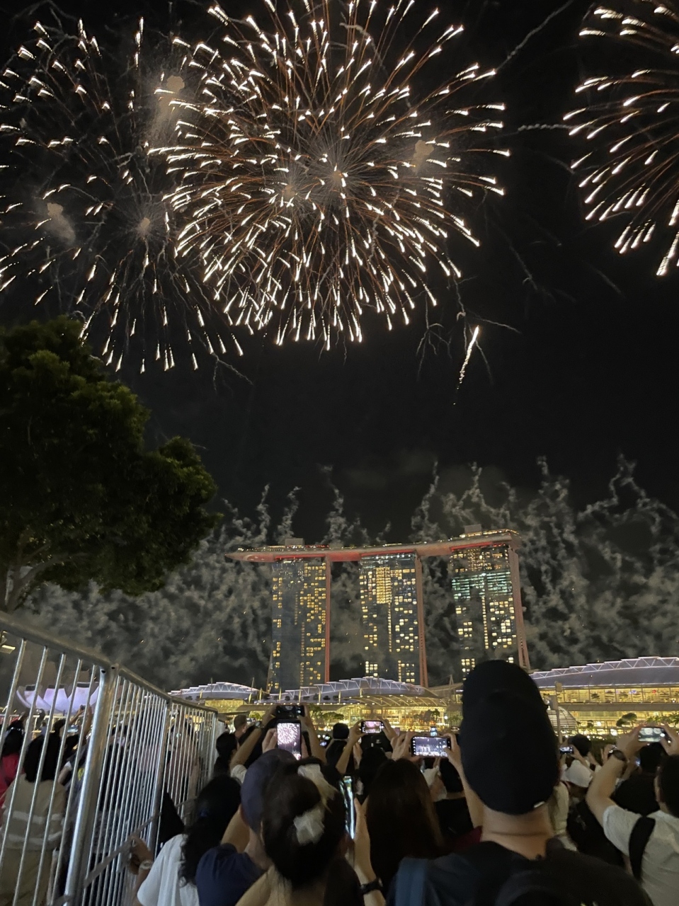 マリーナエリアで花火を鑑賞しました。20時過ぎからの花火で、17:30頃、マーライオン公園の方面へ向かいましたが、すごい人でした。18時頃、自分がいたエリアは柵が閉じられ、新しく人が入らないようになりました。警備員や警察がしっかり警備していたので、快適に花火を鑑賞できました。期待以上に豪華で華やかな花火ショーに、早くから待ってよかったと思いました。