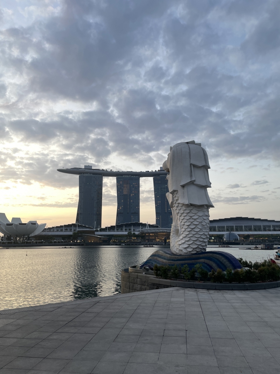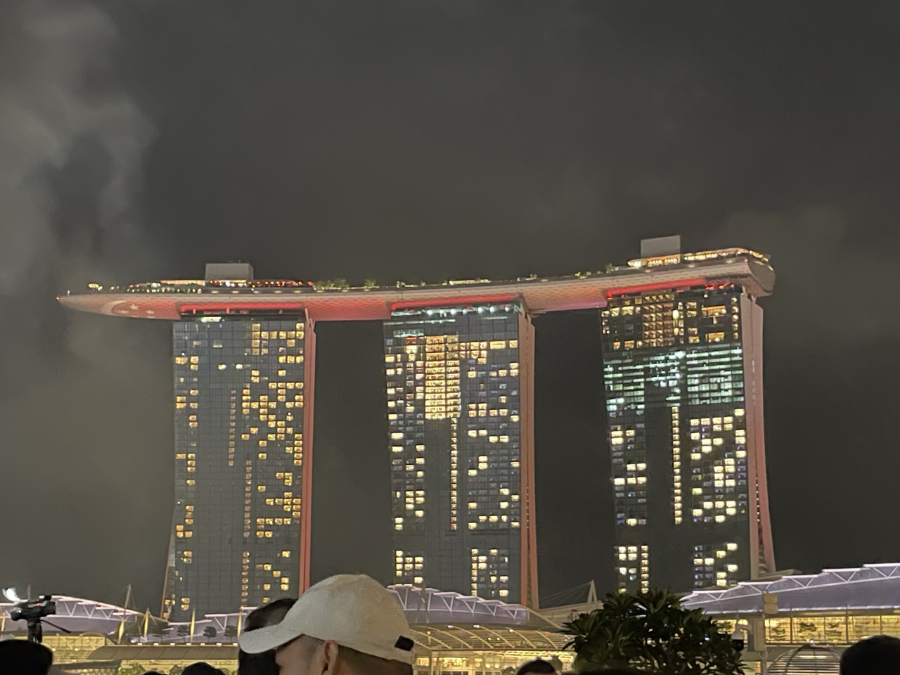 マリーナベイサンズはシンガポールを代表する建物で、ホテルやショッピングが入っている総合施設です。8月9日のナショナルデーにあわせて、ナショナルデー仕様のライトアップがされていました。シンガポールの国旗をデザインしたライトアップでした。