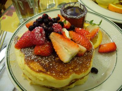 私達がオーダーしたものは、Eggs BenedictとButtermilk Batter Pancakes (3)With Fresh Seasonal Berries。