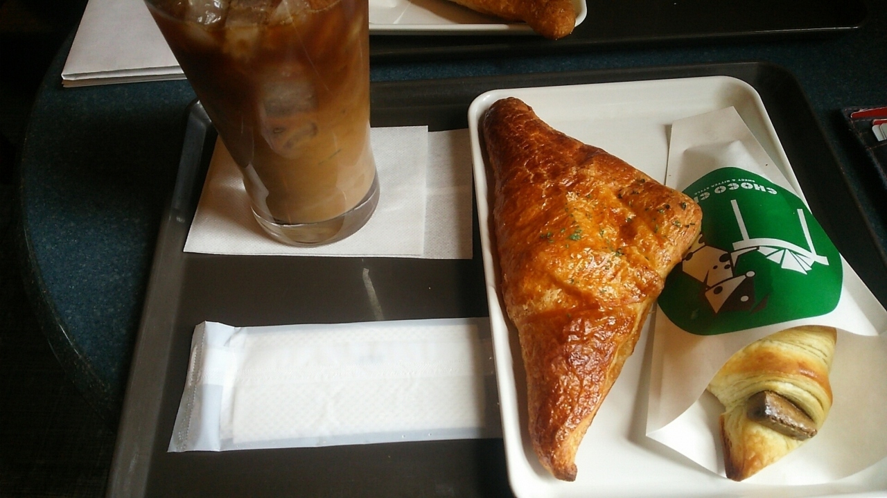 期間限定のミルクティチョコクロを選択、お総菜パンはミートパイのような三角のパンをいただきました。
