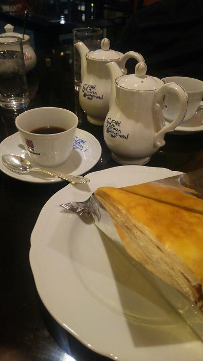ミルフィーユかモンブランを。。。と思ったらあいにく売り切れで、ミルクレープとコーヒーをオーダー。
