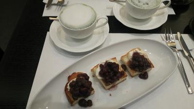 モーニングは、餡とマスカルポーネチーズののったトースト( 半分)とドリンク。