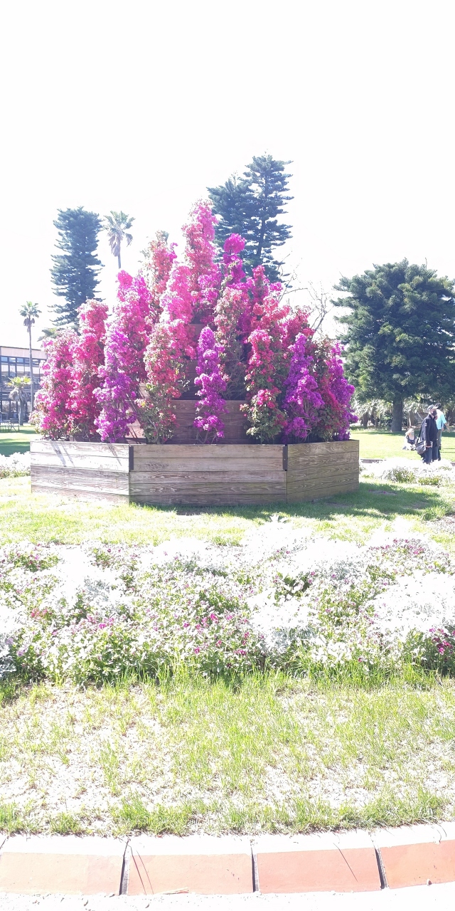 中心には宮崎の青い空にぴったりのトロピカルカラーの花が。