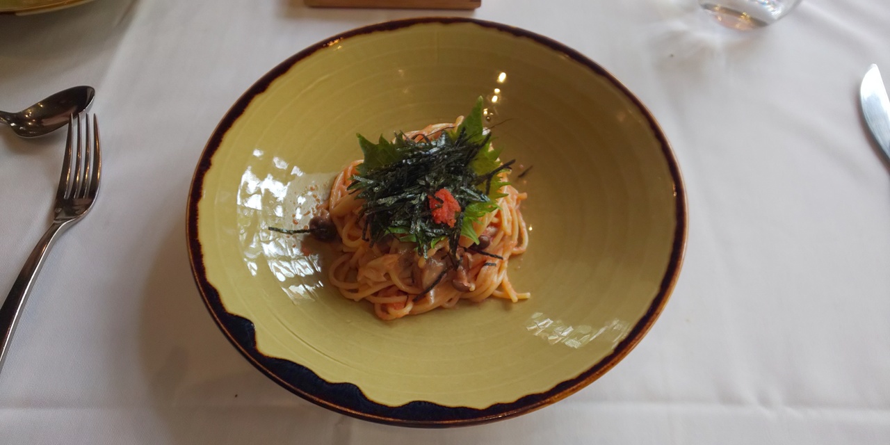 イチゴのスパークリングドリンク、イカの前菜、明太子のパスタにデザート。