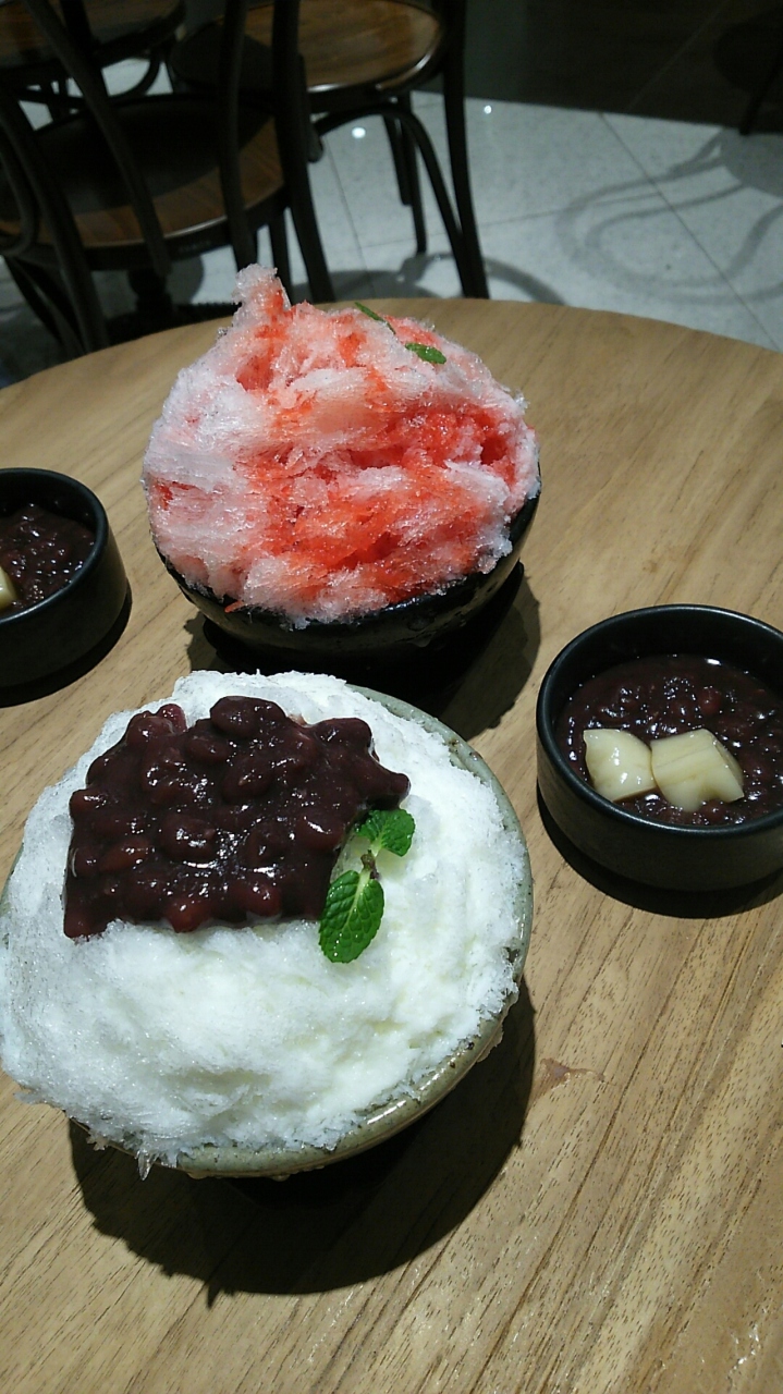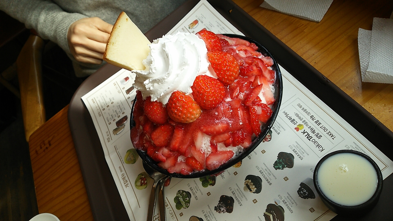 恵化大近くにあるかき氷専門店、ソルビンです。季節限定のイチゴのかき氷をいただきました。チーズケーキがのっていて、12000w。二人~三人で食べるとちょうどよい量です。他にも季節限定の品が数種類ありました。