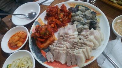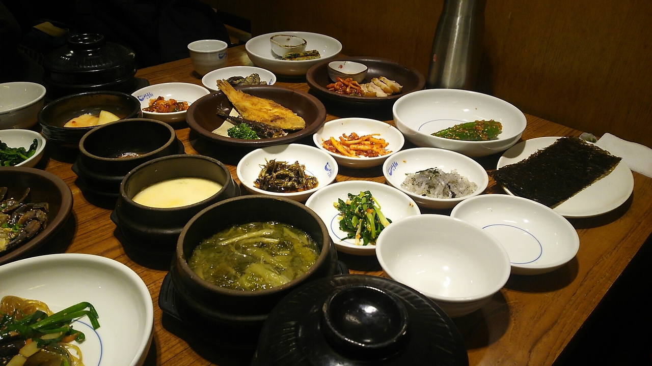 高速ターミナル、ゴートゥーモール直結の定食やさんです。一人16000wで、釜入りのゴハン、チヂミ、ポッサムほか、テーブルに乗りきらないほどのおかずが出てきます。