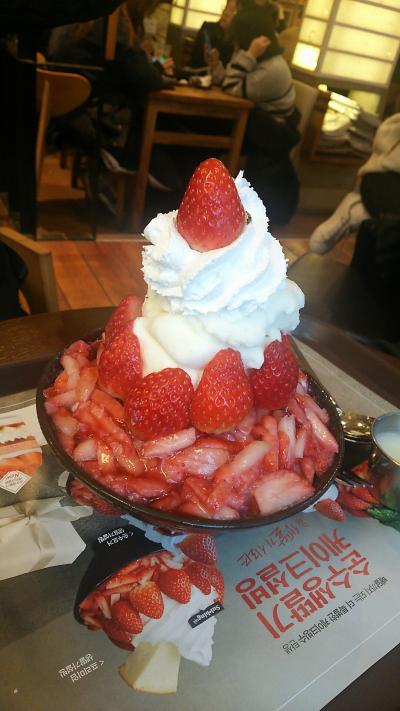 カフェスペースが広く、お客さんでにぎわっていました。イチゴとヨーグルトのソルビンをオーダー。3人で食べて、ちょうどいいくらいのサイズでした。お値段は13,000W。- 旅行時期