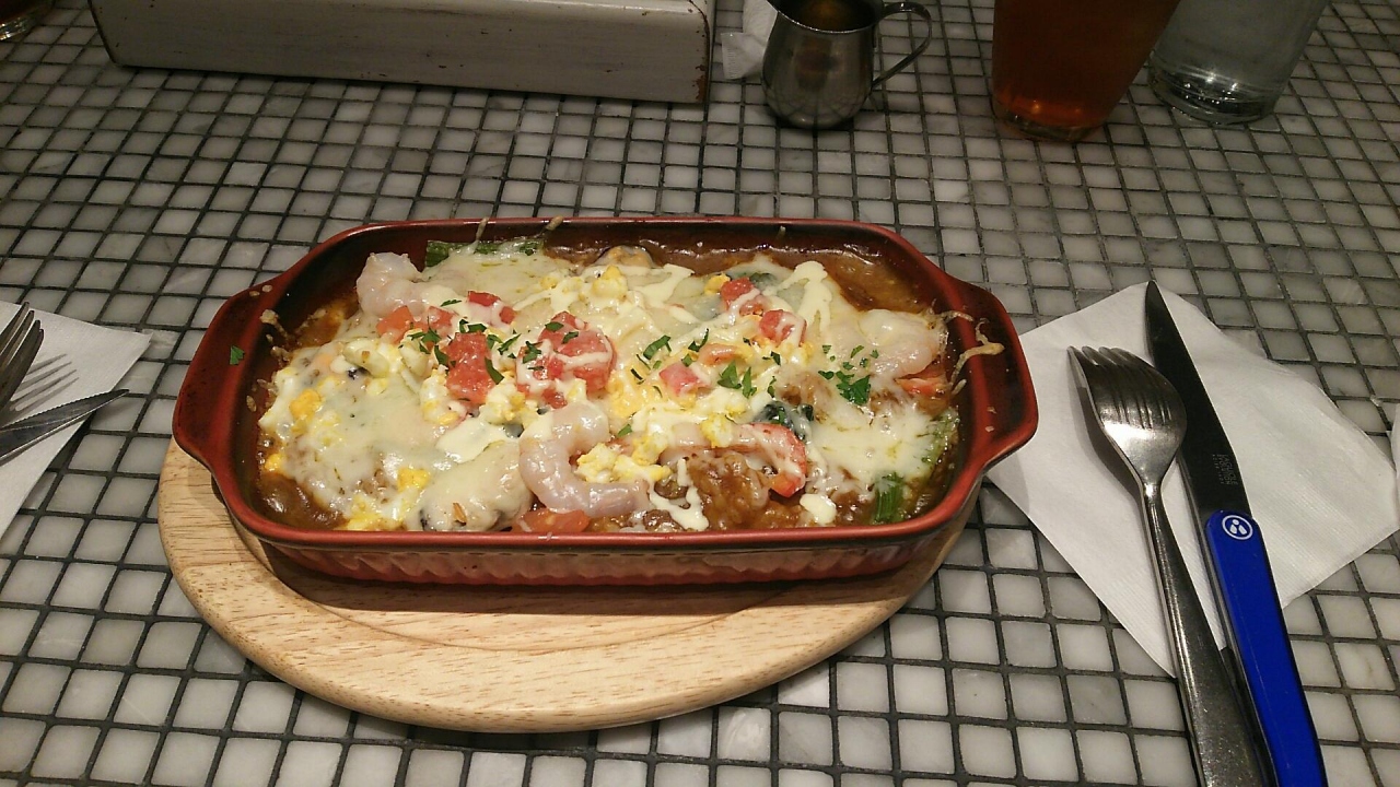 海鮮(海老、牡蠣)等の具が乗った、食べごたえのある焼きカレーでした。
