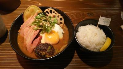 種類が多く迷いましたが、ベーコンのスープカレーに小さいハンバーグをトッピングしたものをオーダー。
