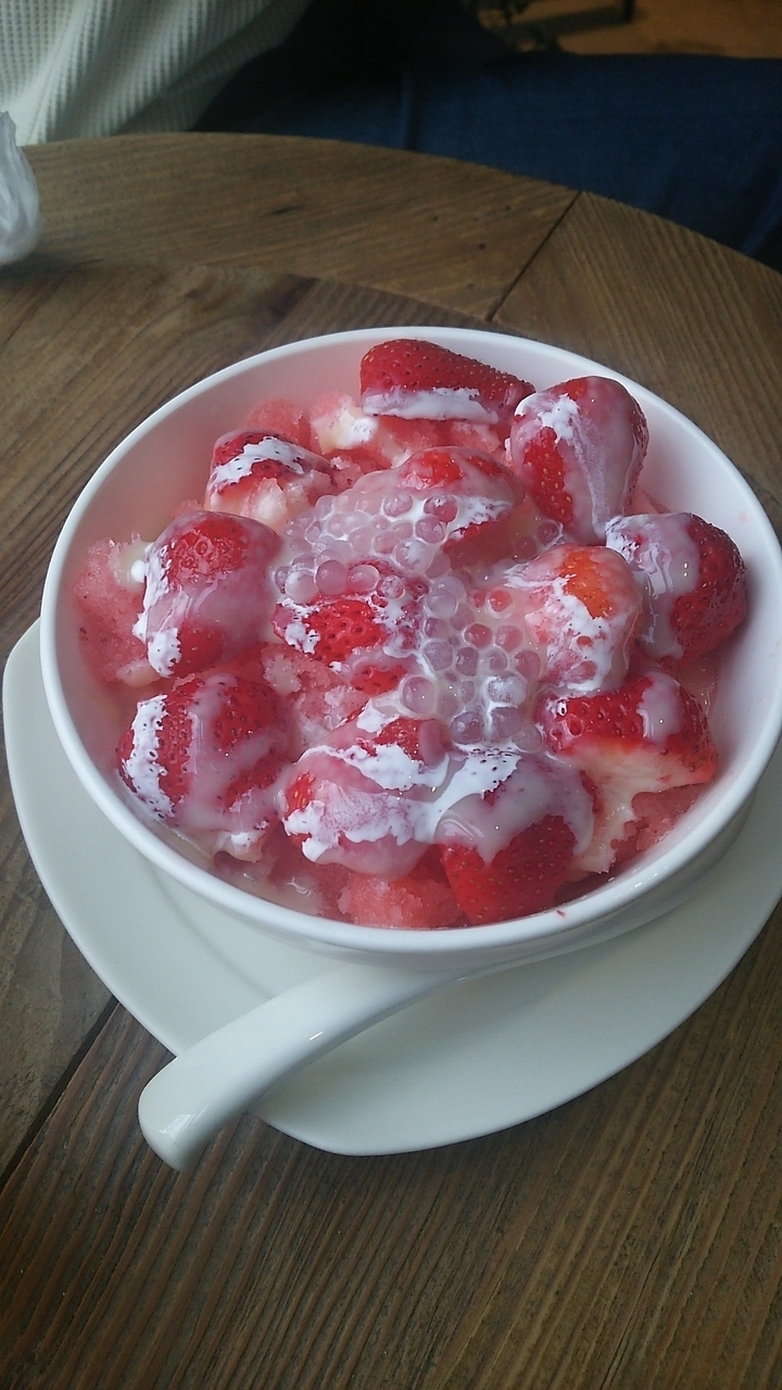 豆花の上にイチゴのソルベとタピオカ、イチゴがのっています。