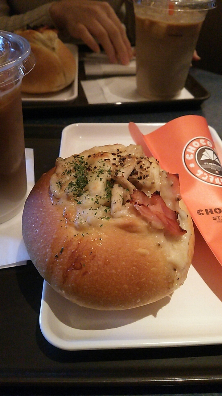 ホワイトシチューの入ったパンとチョコクロ、アイスのカフェラテをいただきました。