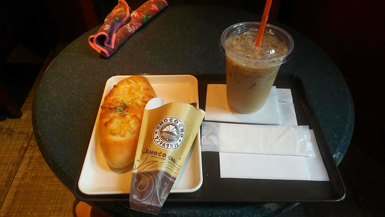 平日のランチタイムに利用。パン(コーンがのっていました)とチョコクロ、アイスラテ。パンは焼き立てでした。大きさは大きいのですが、ふわふわで、ヴォリュームはあまりありません。ランチタイムだったのもあり、パンの種類も豊富でした。- 旅行時期