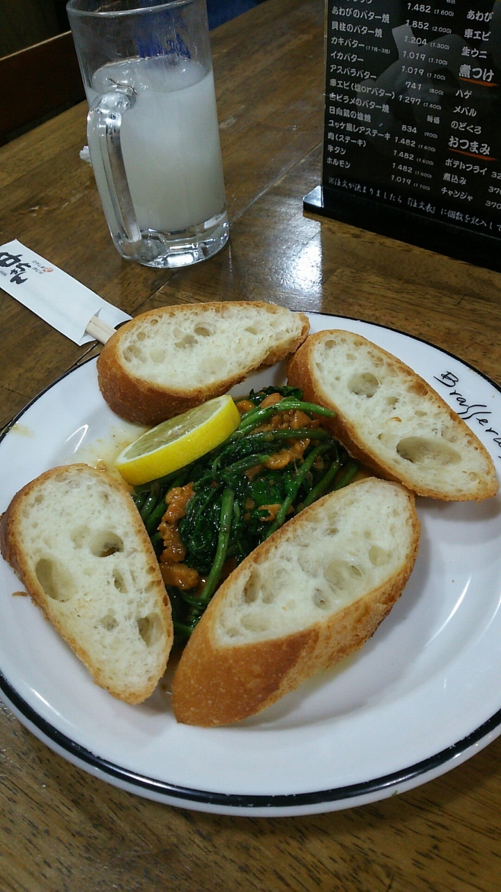 うにクレソンはうにとクレソンをいためたものを、フランスパンに乗せていただく、珍しいお料理。