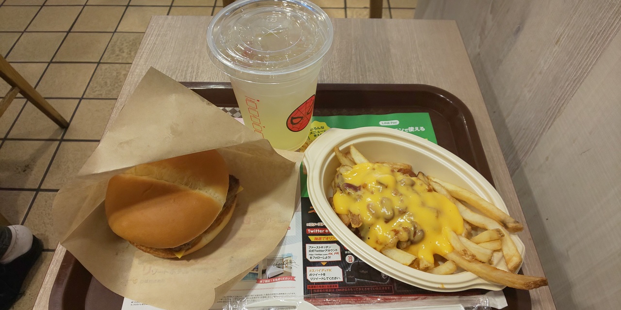 マッシュルームメルトバーガーとチリチーズポテト、ドリンクはレモネードでいただきました。