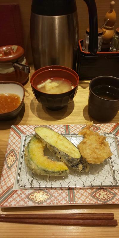 天ぷら定食をオーダー。かぼちゃ、ナス、鶏、キス、海老、たまご(ともう一種類あったと思います)の天ぷらが順序よく運ばれてきました。