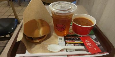 ベーコンエッグバーガーのミニサイズとチリ、アイスピーチティーのセットをいただきました。