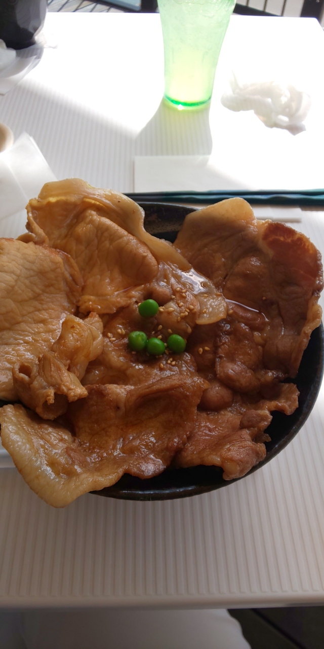 豚丼は甘目のタレのかかった大きな豚肉が丼からあふれるほど。- 旅行時期