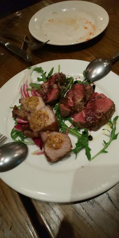 コースで利用、前菜、生ハム盛り合わせ、パスタ、ピザ2種類とメイン料理。