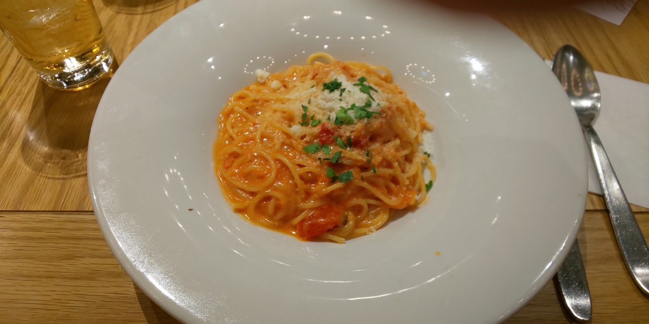 パエリヤ、サラダランチ等もありましたが、トマトクリームのパスタ(サラダ、ドリンク付き1000円)をいただきました。