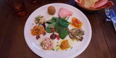 前菜盛り合わせ、パスタは数量限定のラザニアを選択。